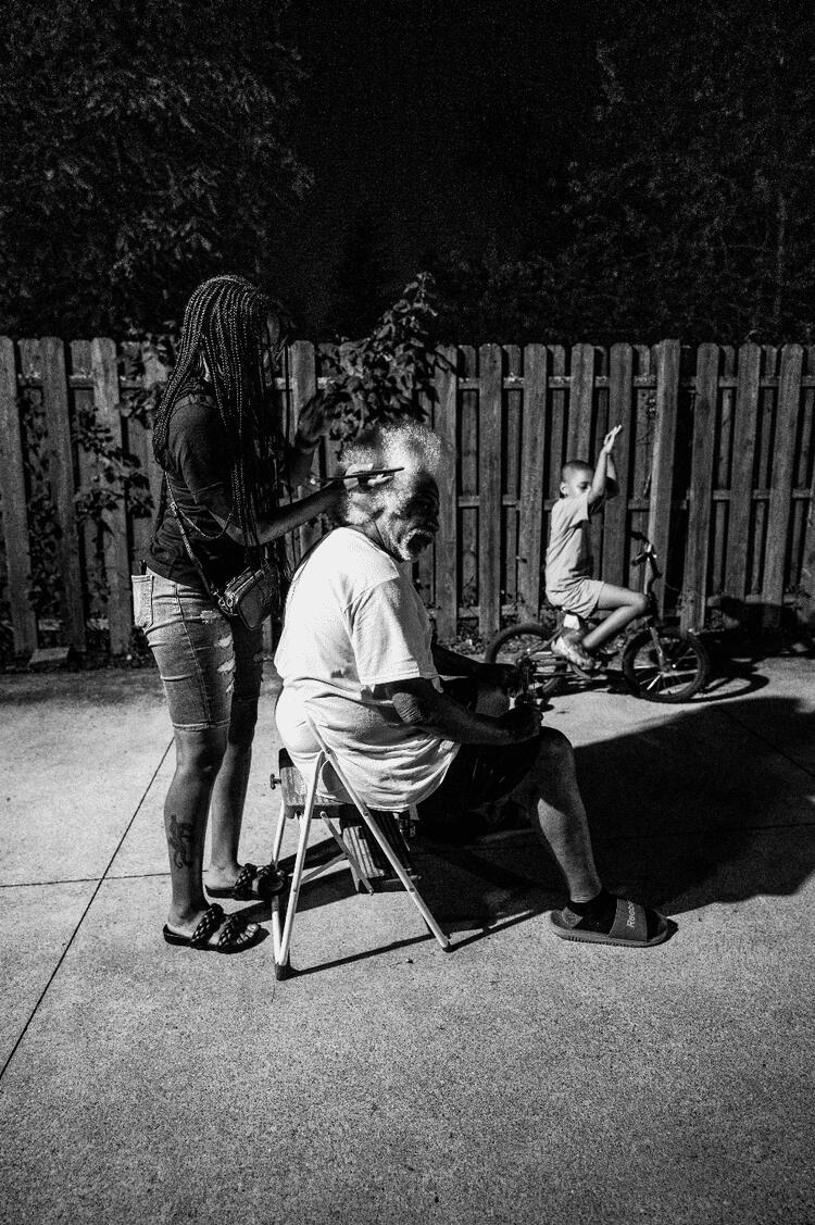 In one striking black-and-white photograph, a young girl braids an elder’s hair while a child rides his bicycle in the background. The scene unfolds in a backyard at night, under the glow of a single light, yet the image radiates warmth and history. It is a portrait of lineage: the act of grooming becomes a metaphor for care and continuity, a reminder that heritage is passed on not only in grand gestures, but in the small, ordinary moments of togetherness.