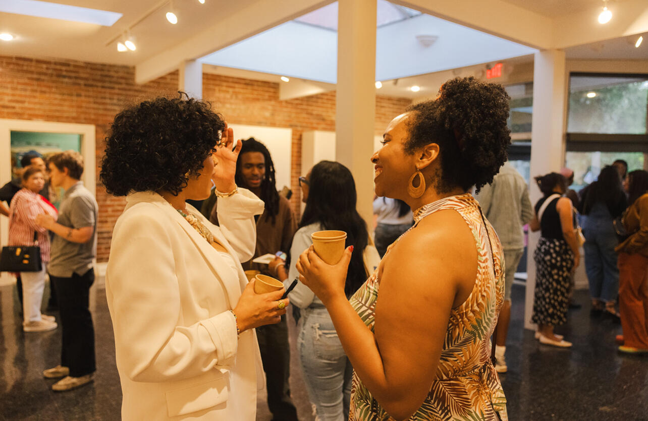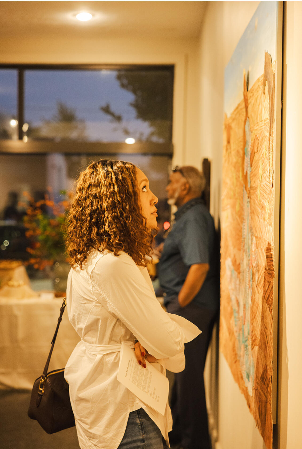 As guests stepped inside Framed Gallery, they were greeted by large-scale figurative works whose rich textures and layered materiality created immersive environments. The atmosphere was hospitable and reflective — wine and light conversation paired with the chance to hear directly from Pearce about her process, her identity, and the journey from “unmasking” to creation.