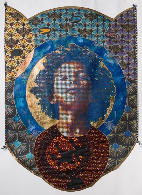 Acrylic, paint, fabric , beads, embroidery