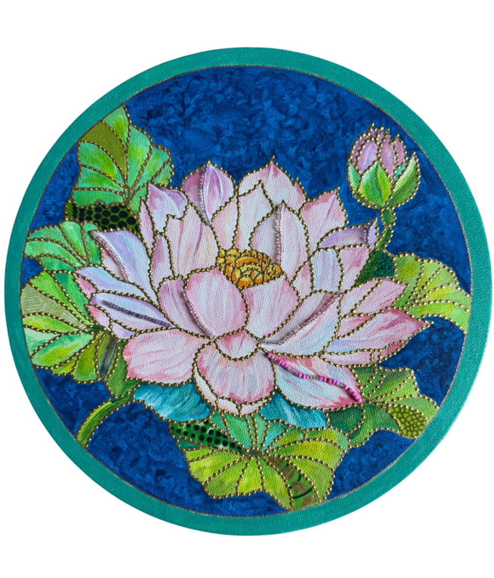 Acrylic, paint, fabric , beads, embroidery