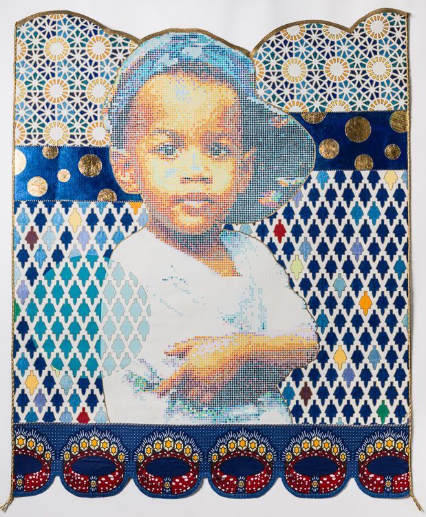 Acrylic, Wax African fabric, beads, embroidery thread, fabric paint