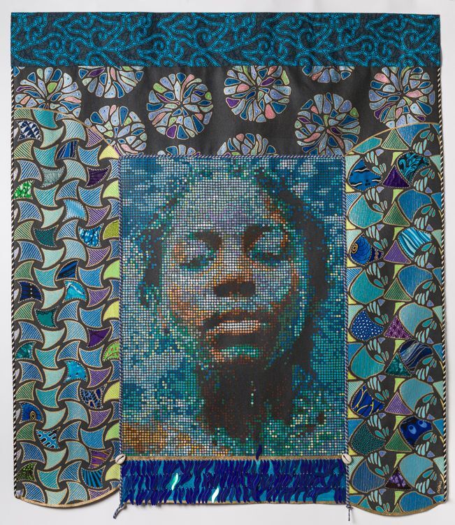 Acrylic, paint, fabric , beads, embroidery