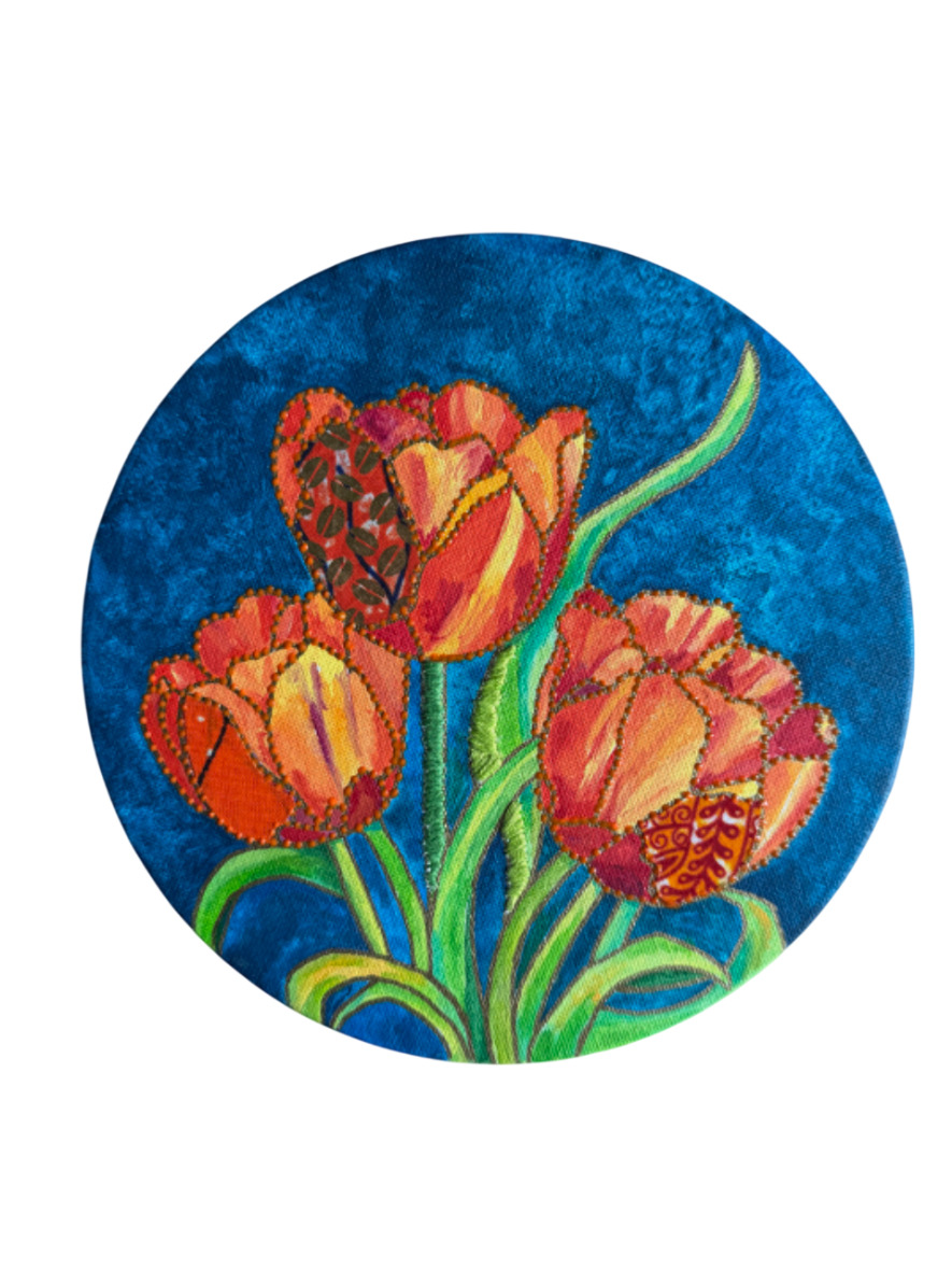Acrylic, paint, fabric , beads, embroidery