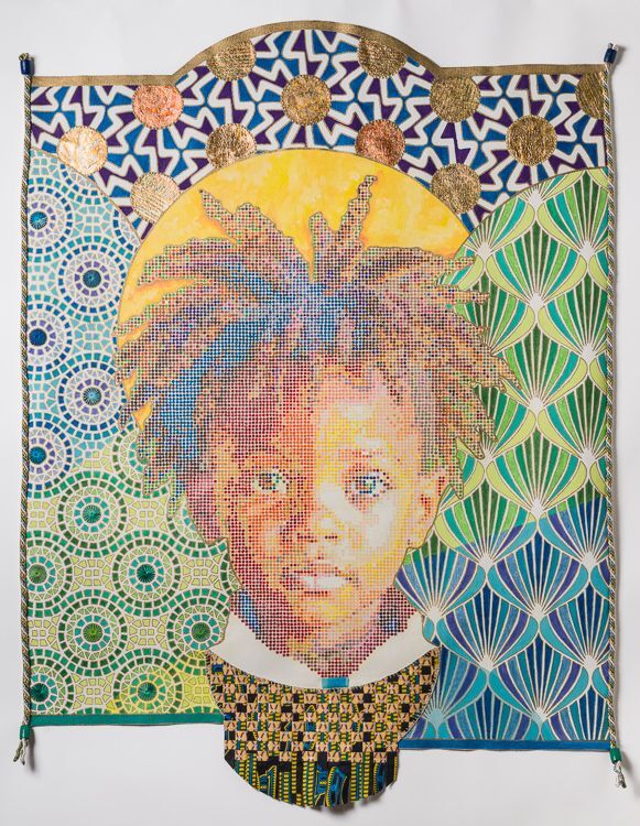 Acrylic, paint, fabric , beads, embroidery